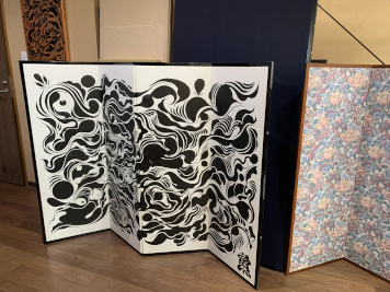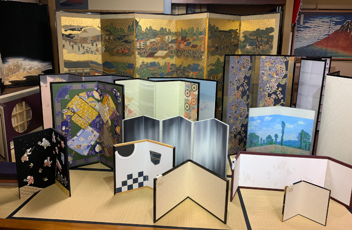 Wishing to learn more about byobu, I visited the Kataoka Byobu Store, the only byobu specialty store remaining in Tokyo, where I discovered that today this traditional decorative item is being arranged in a variety of ways. Byobu are not only displayed in museums; they also have much potential for being used in a wide range of ways in modern living spaces and events.