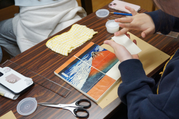 The Kataoka Byobu Store also holds workshops in which participants can experience making the popular Hokusai byobu as karakuri byobu (magic folding screens). These small magic folding screens are mysterious byobu in which different pictures or designs appear each time the screen is opened and closed. Four Hokusai byobu can be enjoyed in one magic byobu. These workshops are a good opportunity for participants, including students on school trips and foreign tourists, with the whole family taking part, to become more familiar with byobu and have great fun to boot.