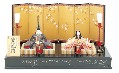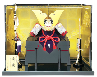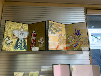 Nevertheless, my image of byobu was museum exhibitions, so I wondered what the main products of a byobu specialty store are. According to Mr. Kataoka, the greatest demand used to be, and still is, for festive byobu. In Japan there are two traditional festivals celebrating the growth of children, the Doll Festival (Momo no Sekku) for girls in March and Children’s Day (Tango no Sekku) for boys in May, and dolls are customarily displayed on both occasions (hina ningyo, or a set of dolls representing the emperor, empress, and attendants, in the former and gogatsu ningyo, or samurai dolls, in the latter). The festive byobu is a small golden screen always displayed behind these dolls.