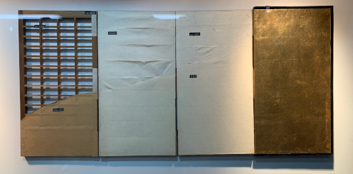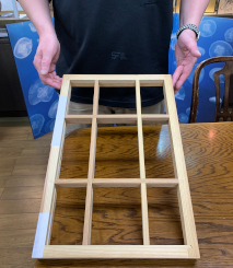 First of all, Mr. Kataoka gave me some basic knowledge about byobu. It is thought that byobu were transmitted to Japan from mainland China about 1,300 years ago. Their structure involves making panel-shaped frames by assembling wooden material in a lattice format and linking these panels horizontally with hinges. Then glue is applied over the wooden frames, and several layers of paper are stretched over them. Finally, foil or designs are applied to the surface.